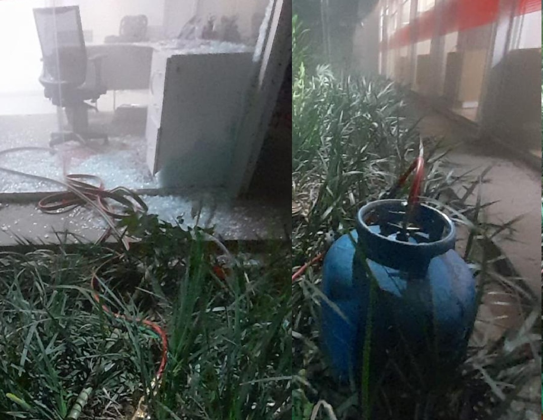Ao chegarem, os policiais encontraram o vidro traseiro da agência estilhaçado e, dentro do local, diversos objetos usados na tentativa de arrombamento: um cilindro de gás, um botijão e um maçarico industrial foram apreendidos como evidência.