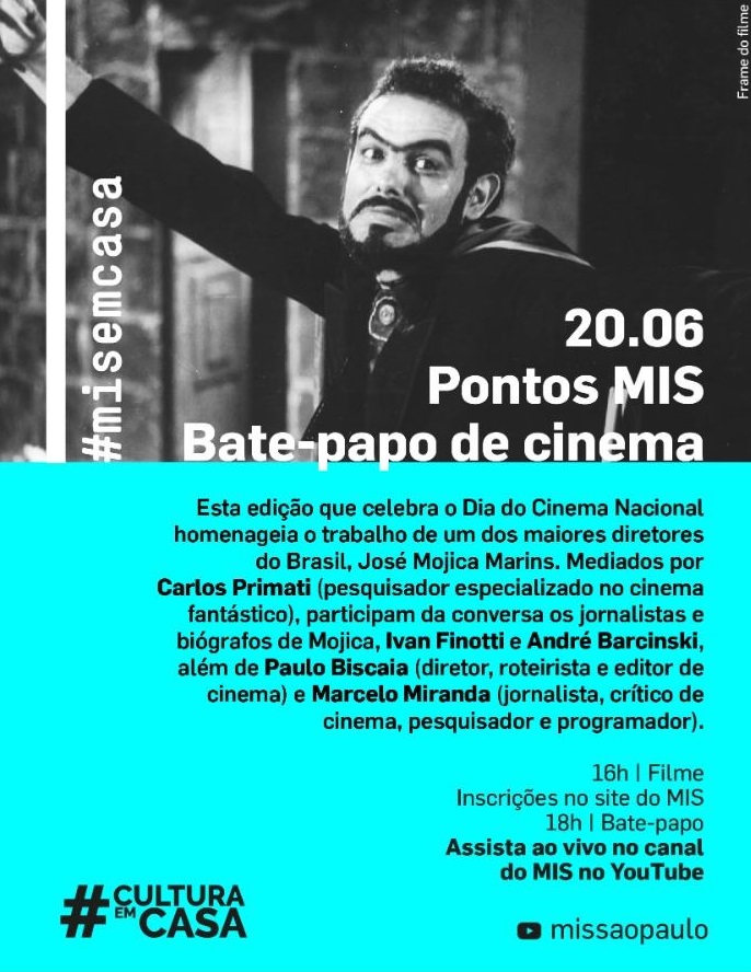 O Ponto MIS – bate-papo de Cinema, programa que apresenta uma sessão de cinema on-line seguida por conversa ao vivo no canal do MIS no YouTube, traz neste sábado, 20, o trabalho de um dos maiores diretores brasileiros, José Mojica Marins, com a exibição de um de seus clássicos: À meia-noite levarei sua alma (Dir. José Mojica Marins, Brasil, 1964, 84min, 16 anos). A sessão, realizada em parceria com a SP Cine Play, acontece gratuitamente às 16h e será seguida por bate-papo ao vivo, às 18h.