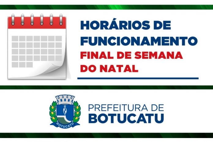 A partir de sexta-feira, 23, a Prefeitura de Botucatu terá horário de expediente alterado devido ao feriado de Natal. No dia 23, o atendimento nas repartições públicas encerra às 12 horas e retorna no dia 26 de dezembro, segunda-feira, a partir das 12 horas. Entre dos dias 27 e 29 de dezembro, o horário de atendimento volta ao normal das 8 às 16h30.