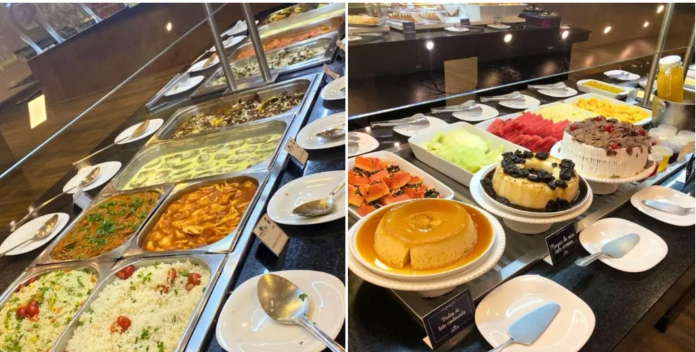 O cardápio conta com opções variadas, como arroz branco, arroz com passas, filé mignon à parmegiana, frango grelhado, rondelle ao molho branco, creme de milho, panaché de legumes e uma seleção de saladas (Caprese, Waldorf, Tropical e Caesar). Para a sobremesa, os destaques são pudim de leite, torta holandesa, torta paulista e salada de frutas.