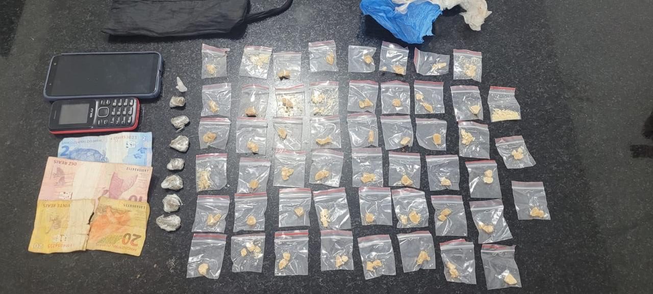 Durante a revista, os policiais localizaram uma pochete contendo 51 porções de crack, 7 porções de maconha e 1 pino de cocaína. Além dos entorpecentes, também foram apreendidos celulares e uma quantia em dinheiro em espécie, reforçando os indícios de atividade de comércio ilegal.