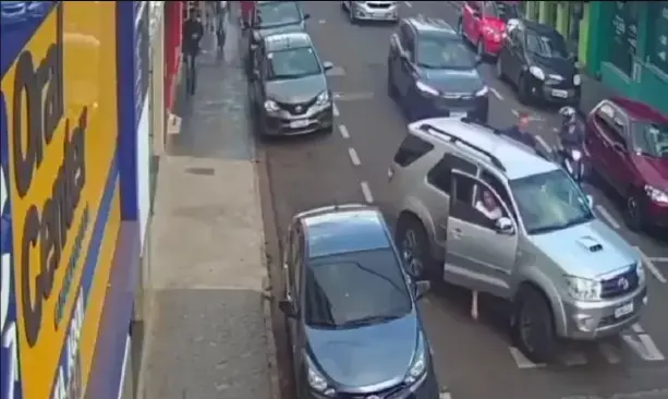 Segundo a Polícia Militar, a equipe foi acionada pelo marido da vítima. Nas imagens de segurança, é possível ver que o suspeito abre a porta do veículo e entra. A mulher, que estava no banco do passageiro, tenta fugir, mas é impedida. Ela fica pendurada na porta e o homem sai com o veículo.