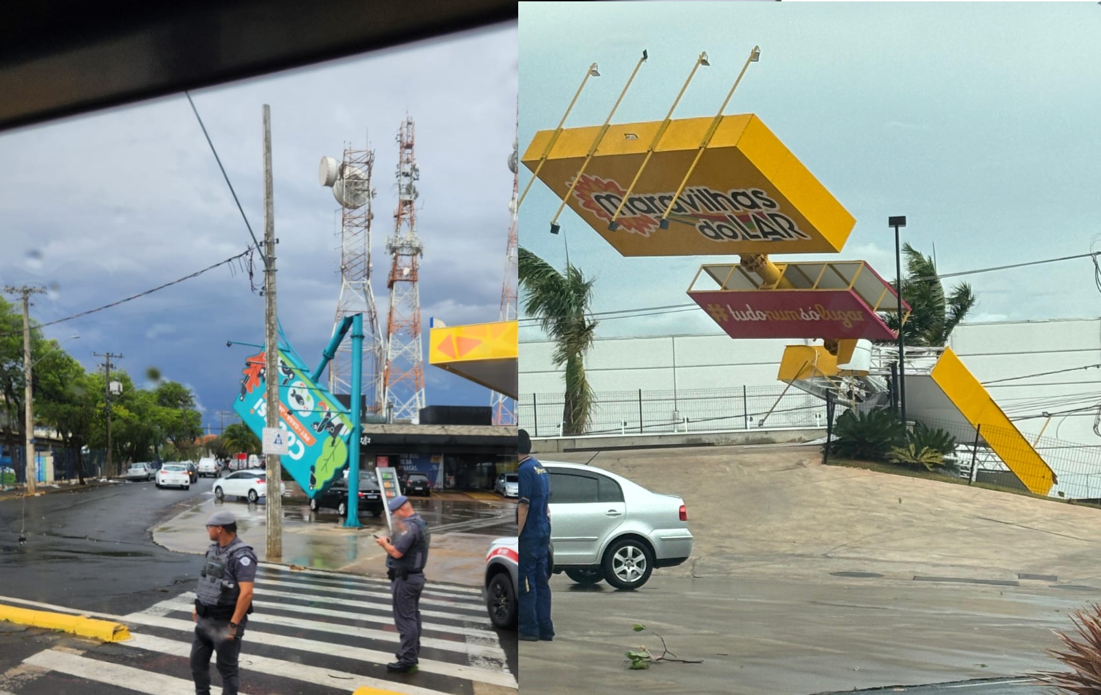 Duas grandes estruturas de metal na entrada da cidade, das lojas Cobasi e Maravilhas do Lar foram danificadas com a força do temporal.
